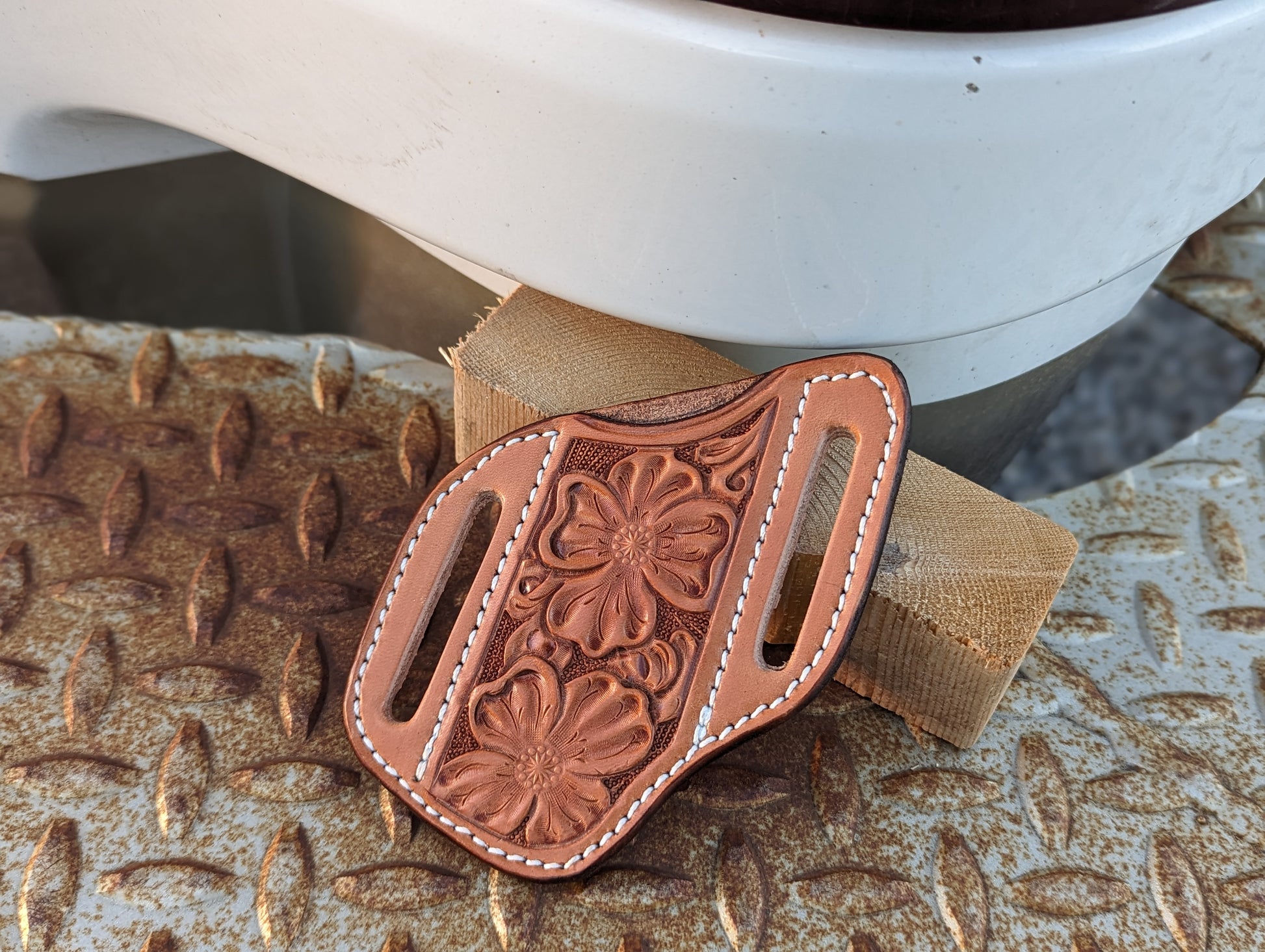 These angled pocket knife sheaths are designed for trapper style knives, but work with many other knives in that size range. Accommodates belts up to 1.5"wide, angling the knife for easy access when worn on the back. Made of two layers of medium weight Herman Oak Veg-tan leather, they are firm enough to wear well, but not so heavy to be uncomfortable. They will develop a nice patina with wear.