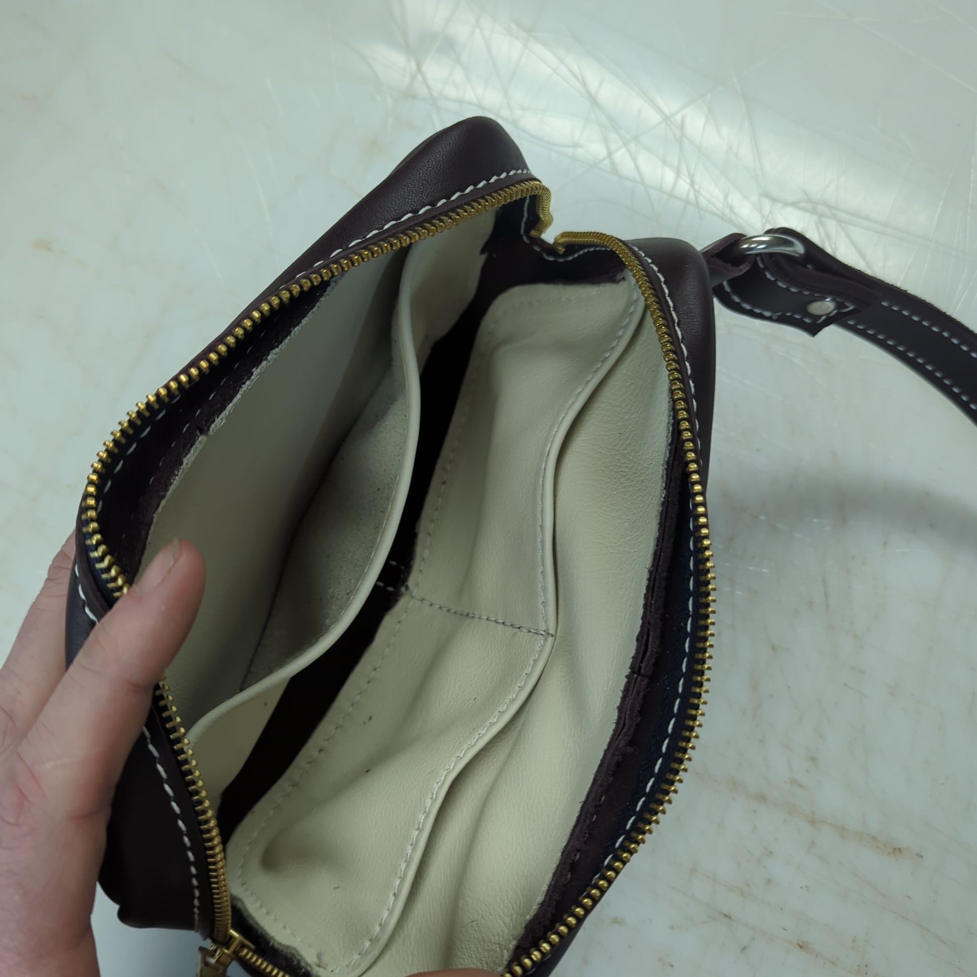 Burgundy leather crossbody bag. White stitching details with stainless hardware and YKK zippers. Internal pockets with external zipper pocket on the back.