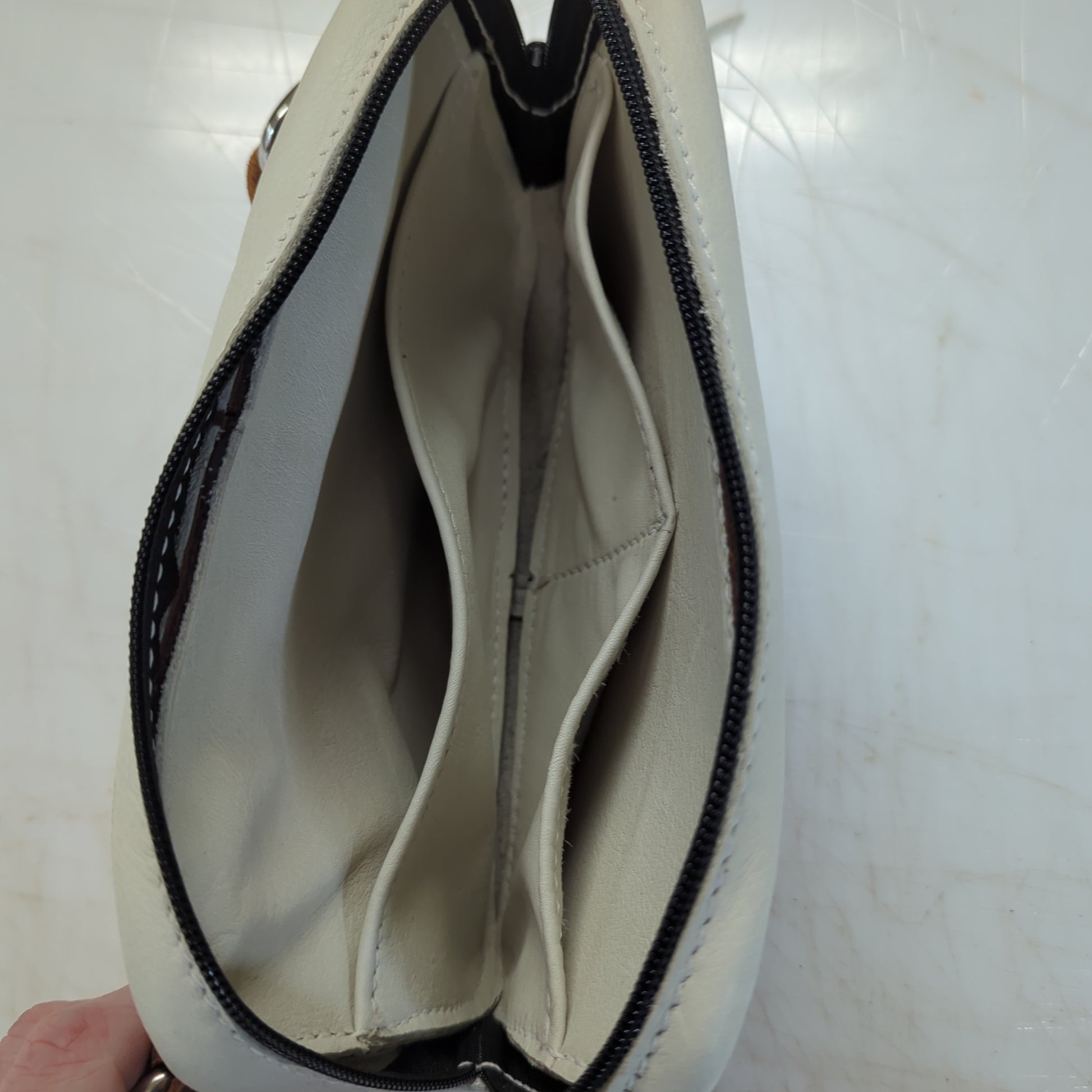 Cream and brown leather crossbody bag. White stitching details with stainless hardware and YKK zippers. Internal and external pockets with zipper pocket on the inside.
