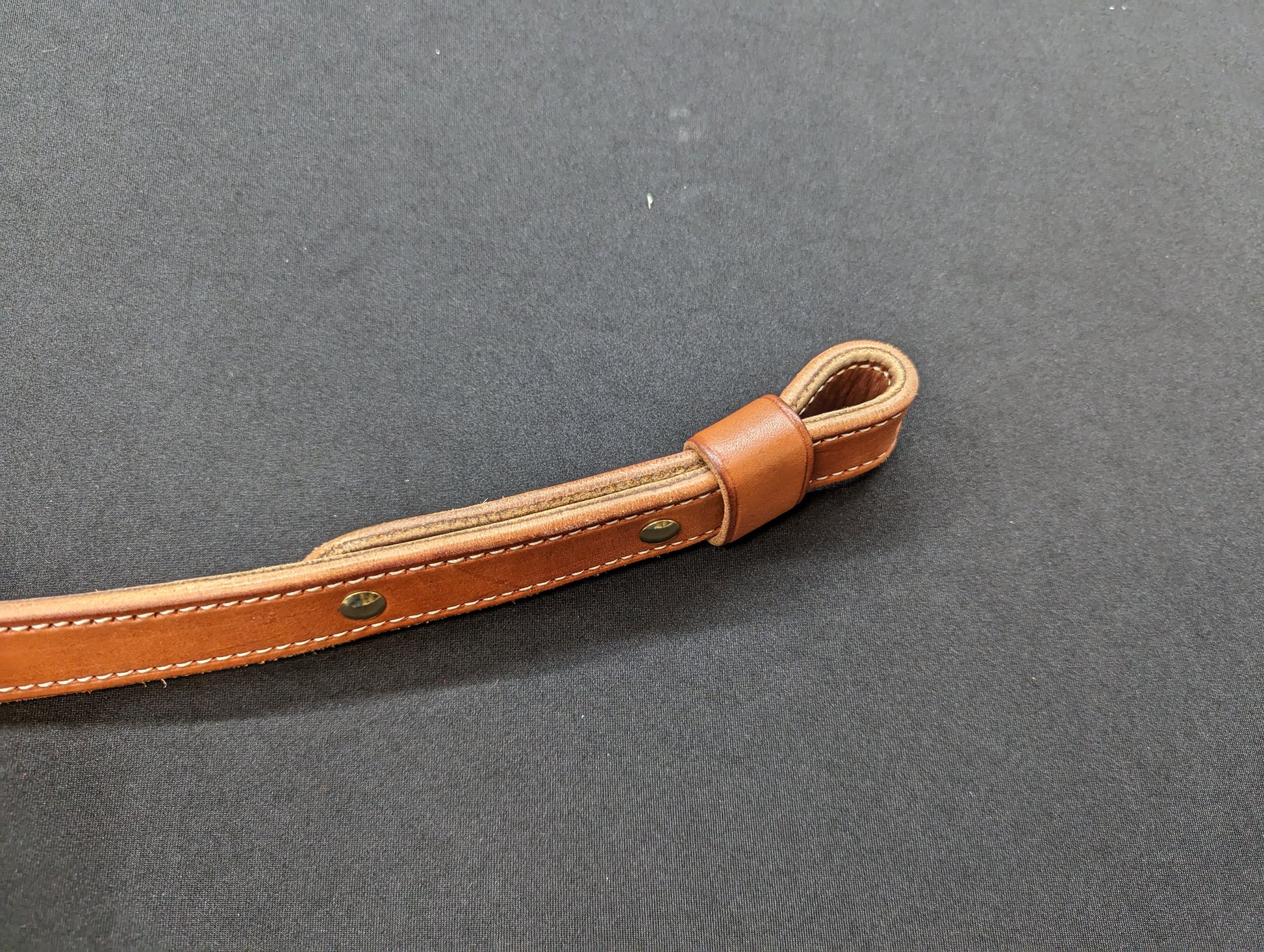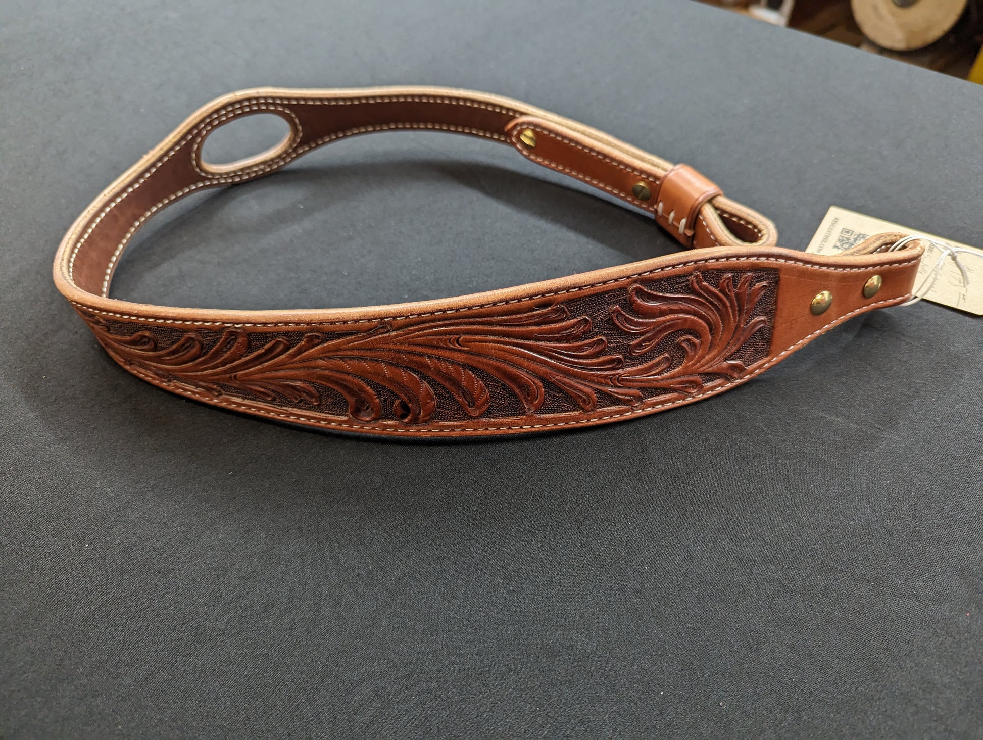 Floral tooled rifle sling. Saddle skirting lined with oil tan chap leather and stitched. Brass Chicago screws.